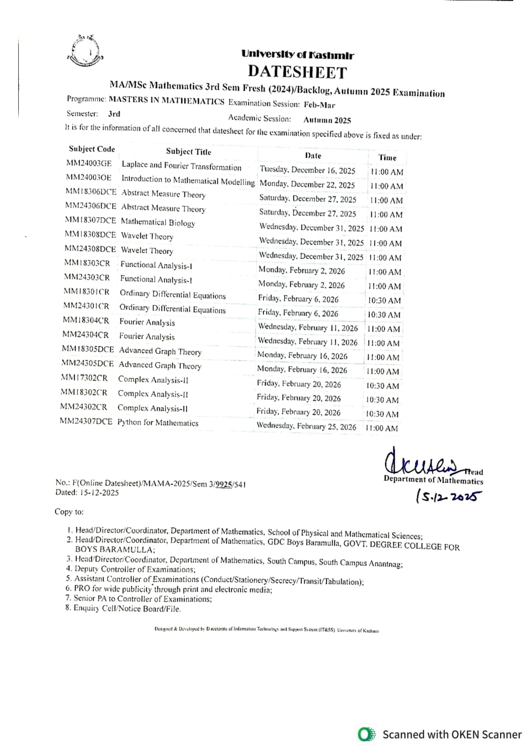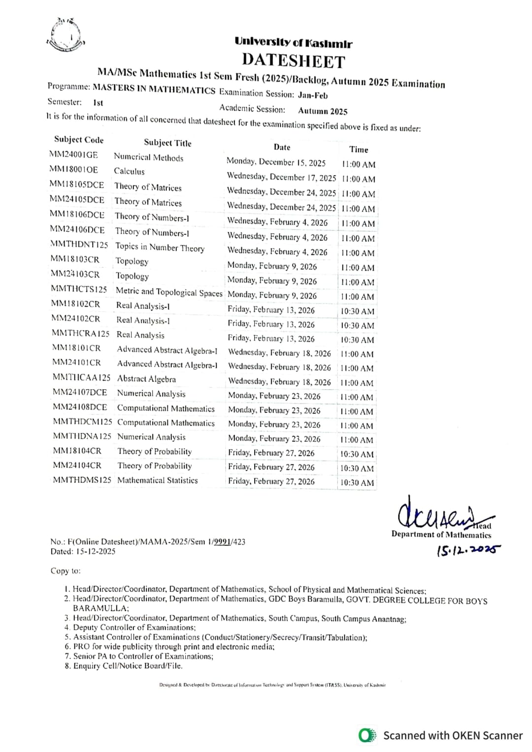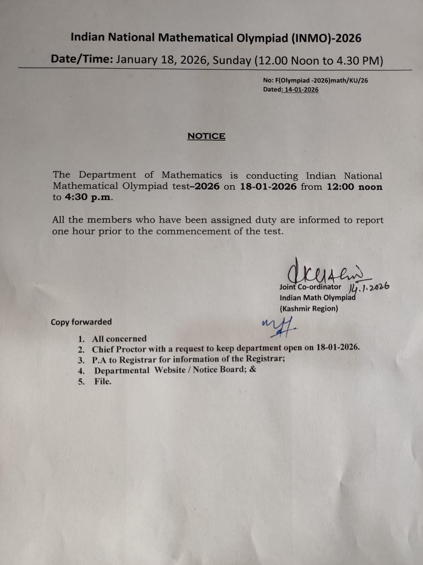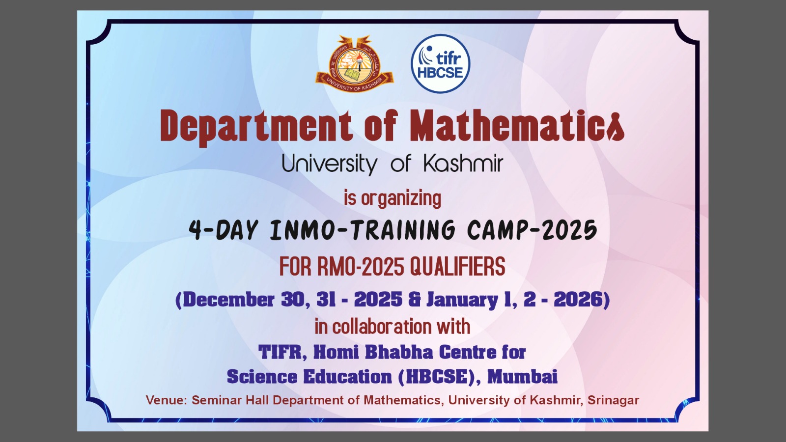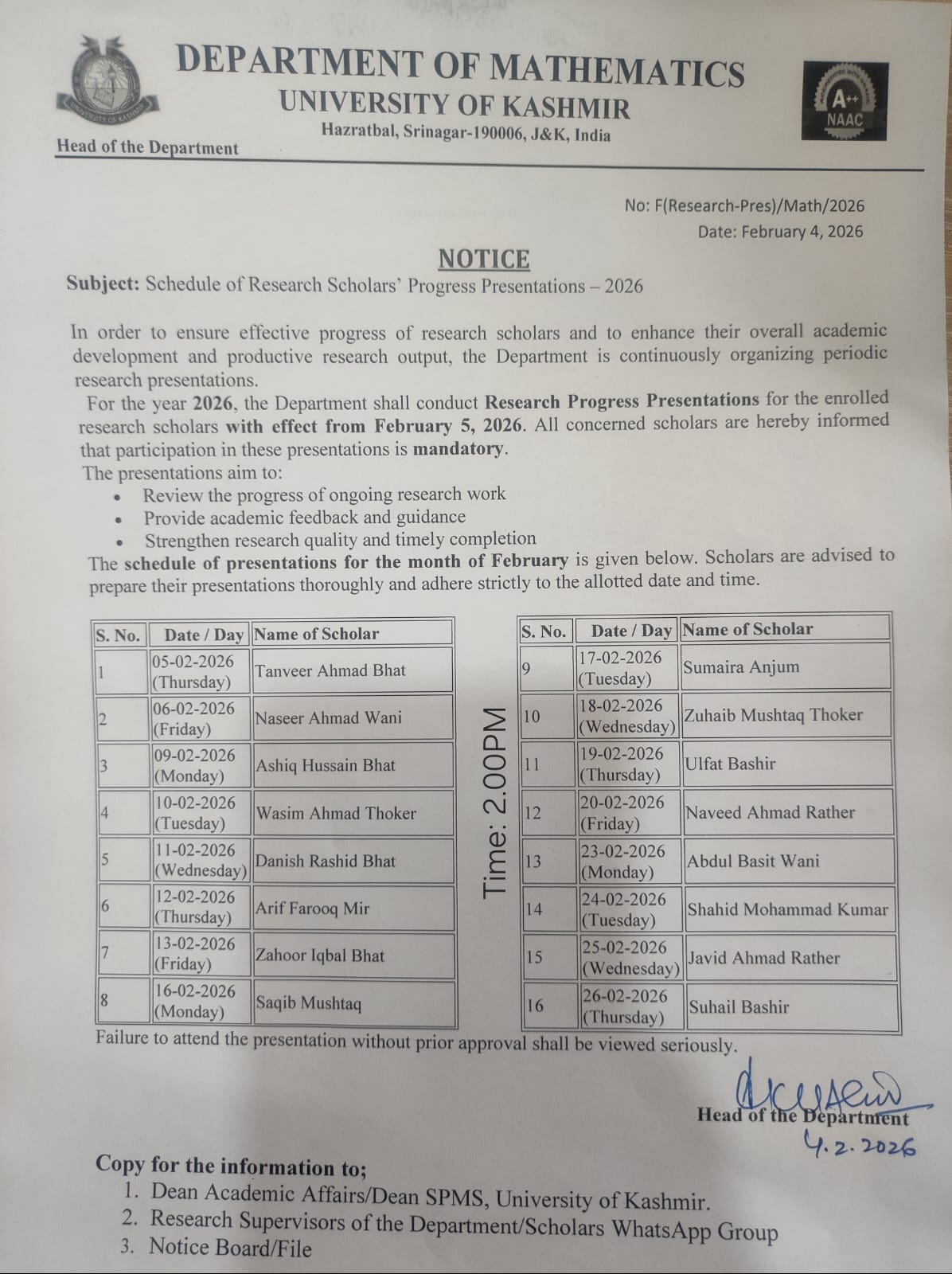 The Department of Post-Graduate studies in Mathematics was established in 1958 under the headship of Prof. M. R. Puri which was later upgraded to the P.G. Department of Mathematics and Statistics when the postgraduate classes leading to M. Sc. Degree in Statistics were started in 1988. Subsequently, the Department of Statistics was established as an independent department in 2004. In 2007, the Department has extended masters programmes in Mathematics at South Campus and in 2010 at Govt Degree College, Baramulla. About 65 students get enrolled at South campus and 45 at GDC Baramulla for M.Sc. M